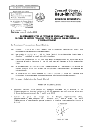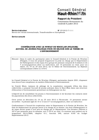 Dans le cadre du partenariat entre le Conseil Général et le Powiat de Wroclaw (Pologne), il vous est proposé d’approuver la prise en charge par le Département de l’hébergement et des repas d’un groupe de polonais composé de 6 enfants et de 4 accompagnateurs (dont un traducteur), soit 10 personnes au total, pour un séjour, du 19 au 25 août 2012, sur le thème de l’environnement. La dépense correspondante s’élève à 2 570 €.