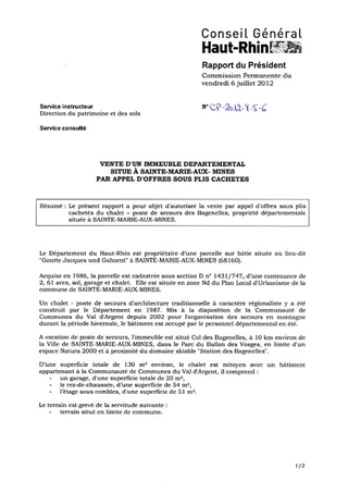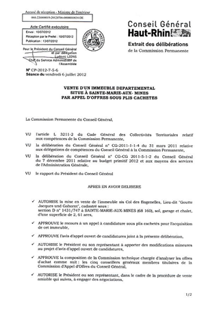 VENTE D'UN IMMEUBLE DEPARTEMENTAL SITUE A SAINTE MARIE AUX MINES PAR APPEL D'OFFRES SOUS PLIS CACHETES. Resumé Pièces jointes DELIBERATION RAPPORT Assemblée : Commission Permanente Date : 06/07/2012 Rapporteur : Non défini Collectivité : Conseil départemental du Haut-Rhin Direction : Non défini Service : Service du Patrimoine et du droit des Sols Domaine : Administration Commission : Commission Permanente