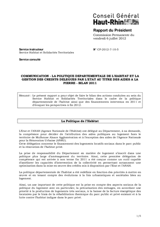 Le présent rapport a pour objet de faire le bilan des actions conduites au sein du Service Habitat et Solidarités Territoriales dans le cadre de la politique départementale de l’habitat ainsi que des financements intervenus en 2011 et d’évoquer les perspectives à fin 2012.