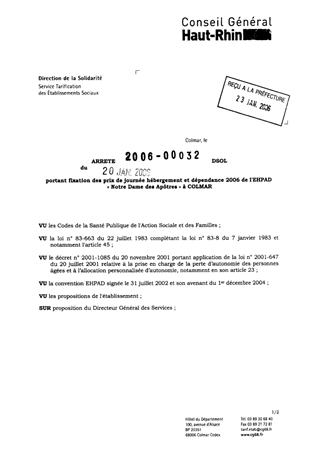 portant fixation des prix de journée hébergement et dépendance 2006 de l'EHPAD "Notre Dame des Apôtres" à COLMAR. Resumé Pièces jointes ARRETE Assemblée : Non défini Date : 20/01/2006 Rapporteur : Non défini Collectivité : Conseil départemental du Haut-Rhin Direction : Non défini Service : Service de la Tarification des Etablissements Domaine : Prix de Journée Commission :
