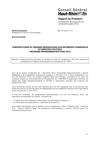 CONSTRUCTIONS ET GROSSES REPARATIONS AUX BATIMENTS COMMUNAUX ET EDIFICES CULTUELS DEUXIEME PROGRAMMATION POUR 2012