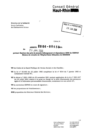 portant fixation des prix de journée hébergement et dépendance 2006 de l'EHPAD maison de retraite de l'hôpital Saint Sébastien de RIXHEIM. Resumé Pièces jointes ARRETE Assemblée : Non défini Date : 20/01/2006 Rapporteur : Non défini Collectivité : Conseil départemental du Haut-Rhin Direction : Non défini Service : Service de la Tarification des Etablissements Domaine : Prix de Journée Commission :