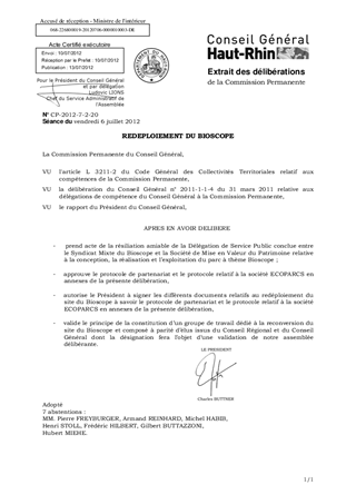 Le présent rapport a pour objet de donner acte au Président de sa communication relative à la résiliation amiable de la délégation de service public (DSP) entre le Syndicat Mixte du Bioscope (SYMBIO) et la Société de Mise en Valeur du Patrimoine (SMVP), d'approuver le protocole de partenariat concernant l'avenir du site et le protocole relatif à la société ECOPARCS SA entre la Caisse des Dépôts et Consignations (CDC), la Compagnie des Alpes (CDA), le Symbio, la Région Alsace et le Département du Haut-Rhin.