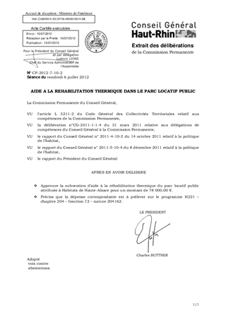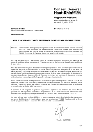 Dans le cadre de la politique départementale de l’Habitat mise en place à compter de 2011, une opération de réhabilitation thermique menée par Habitats de Haute-Alsace est éligible à une subvention départementale pour un montant de 78 000 €, au titre de l’aide en faveur du parc locatif public.