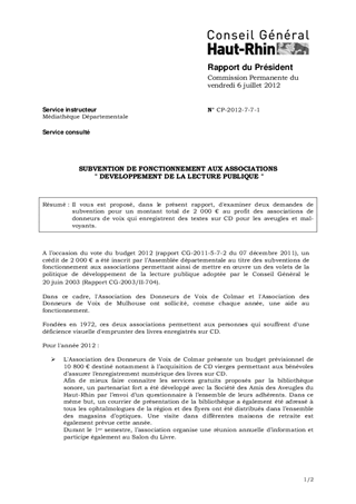 Il vous est proposé, dans le présent rapport, d'examiner deux demandes de subvention pour un montant total de 2 000 € au profit des associations de donneurs de voix qui enregistrent des textes sur CD pour les aveugles et mal-voyants.