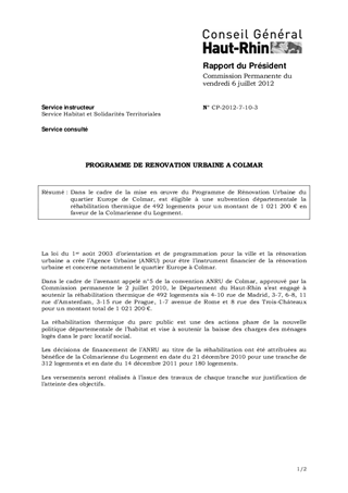 Dans le cadre de la mise en œuvre du Programme de Rénovation Urbaine du quartier Europe de Colmar, est éligible à une subvention départementale la réhabilitation thermique de 492 logements pour un montant de 1 021 200 € en faveur de la Colmarienne du Logement.