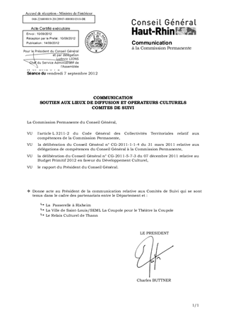 Informations relatives aux Comités de Suivi intervenus en 2011 dans le cadre des partenariats entre le Département et : - La Passerelle à Rixheim - La Ville de Saint-Louis/SEML La Coupole : Théâtre la Coupole - Le Relais Culturel de Thann