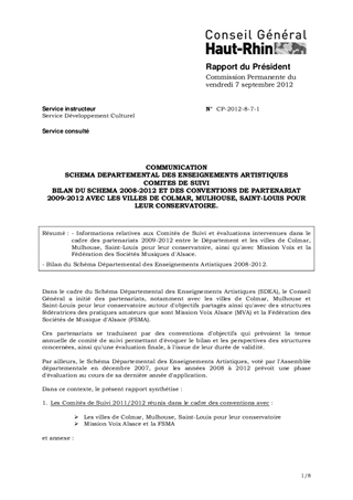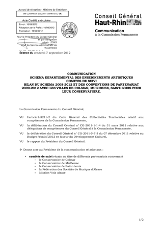 COMMUNICATION SCHEMA DEPARTEMENTAL DES ENSEIGNEMENTS ARTISTIQUES COMITES DE SUIVI BILAN DU SCHEMA 2008-2012 ET DES CONVENTIONS DE PARTENARIAT 2009-2012 AVEC LES VILLES DE COLMAR, MULHOUSE, SAINT-LOUIS POUR LEUR CONSERVATOIRE.