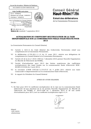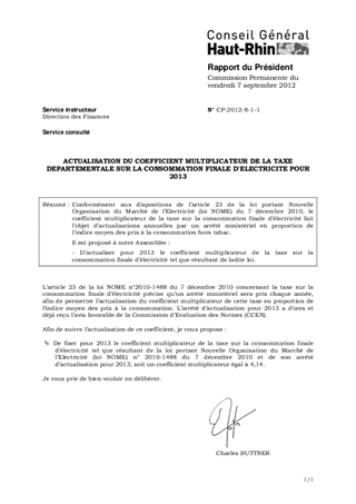 Conformément aux dispositions de l’article 23 de la loi portant Nouvelle Organisation du Marché de l’Electricité (loi NOME) du 7 décembre 2010, le coefficient multiplicateur de la taxe sur la consommation finale d’électricité fait l’objet d’actualisations annuelles par un arrêté ministériel en proportion de l’indice moyen des prix à la consommation hors tabac. Il est proposé à notre Assemblée : - D’actualiser pour 2013 le coefficient multiplicateur de la taxe sur la consommation finale d’électricité tel que résultant de ladite loi.