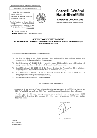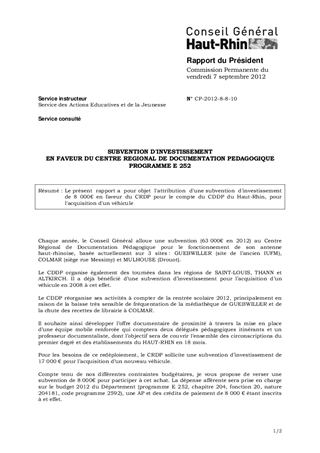 Le présent rapport a pour objet l'attribution d'une subvention d'investissement de 8 000€ en faveur du CRDP pour le compte du CDDP du Haut-Rhin, pour l'acquisition d'un véhicule