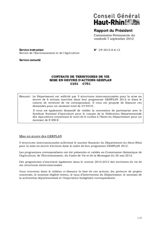 Le Département est sollicité par 5 structures intercommunales pour la mise en œuvre de 6 actions inscrites dans leur programme GERPLAN 2012 et dans le contrat de territoire de vie correspondant. Il vous est proposé de financer ces demandes pour un montant total de 33 934 €. Il vous est également demandé de valider la convention de partenariat avec le Syndicat National d’Apiculture pour le compte de la Fédération Départementale des Apiculteurs concernant le suivi de 6 ruches à l’hôtel du Département pour un montant de 8 000 €.