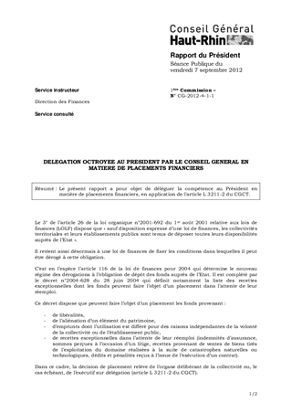 Le présent rapport a pour objet de déléguer la compétence au Président en matière de placements financiers, en application de l'article L 3211-2 du CGCT.