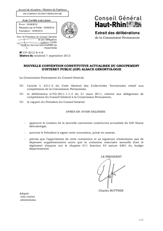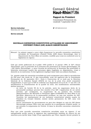 Le présent rapport a pour objet d'approuver la nouvelle convention constitutive actualisée du Groupement d'Intérêt Public (GIP) Alsace Gérontologie, dont le Département du Haut-Rhin est membre, modifiée pour mise en conformité avec la législation en vigueur.
