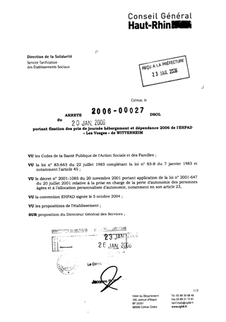 portant fixation des prix de journée hébergement et dépendance 2006 de l'EHPAD "Les Vosges" de WITTENHEIM. Resumé Pièces jointes ARRETE Assemblée : Non défini Date : 20/01/2006 Rapporteur : Non défini Collectivité : Conseil départemental du Haut-Rhin Direction : Non défini Service : Service de la Tarification des Etablissements Domaine : Prix de Journée Commission :