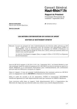 Il vous est proposé de voter l'individualisation de diverses aides prévues au B.P 2012 : l'aide à la vie associative avec les soutiens aux associations UDBA et ARCHIMENE, l'aide au fonctionnement de l'antenne du CREPS à Mulhouse, le soutien aux Mercredis de Neige de l'hiver 2011/2012, ainsi que diverses aides aux clubs et aux comités sportifs. Le total de l'enveloppe à engager dans ce rapport s'élève à 103 678 € en dépenses de fonctionnement.