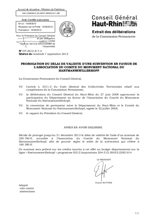 PROROGATION DU DELAI DE VALIDITE D'UNE SUBVENTION EN FAVEUR DE L'ASSOCIATION DU COMITE DU MONUMENT NATIONAL DU HARTMANNSWILLERKOPF
