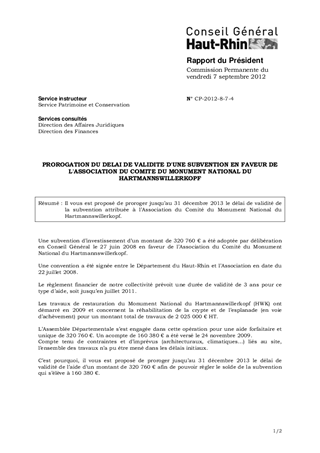 Il vous est proposé de proroger jusqu’au 31 décembre 2013 le délai de validité de la subvention attribuée à l’Association du Comité du Monument National du Hartmannswillerkopf.