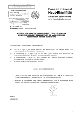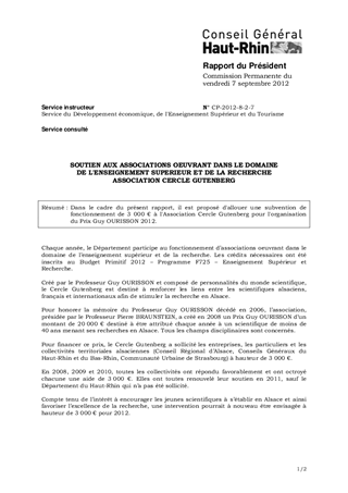 Dans le cadre du présent rapport, il est proposé d'allouer une subvention de fonctionnement de 3 000 € à l'Association Cercle Gutenberg pour l'organisation du Prix Guy OURISSON 2012.