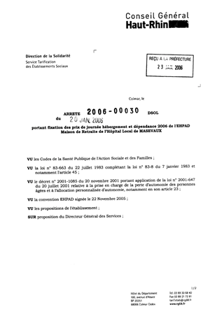 portant fixation des prix de journée hébergement et dépendance 2006 de l'EHPAD maison de retraite de l'hôpital local de MASEVAUX. Resumé Pièces jointes ARRETE Assemblée : Non défini Date : 20/01/2006 Rapporteur : Non défini Collectivité : Conseil départemental du Haut-Rhin Direction : Non défini Service : Service de la Tarification des Etablissements Domaine : Prix de Journée Commission :
