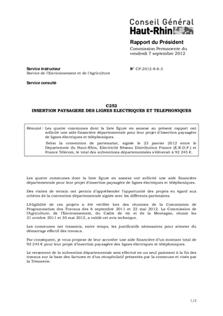 Les quatre communes dont la liste figure en annexe au présent rapport ont sollicité une aide financière départementale pour leur projet d’insertion paysagère de lignes électriques et téléphoniques. Selon la convention de partenariat, signée le 23 janvier 2012 entre le Département du Haut-Rhin, Electricité Réseau Distribution France (E.R.D.F.) et France Télécom, le total des subventions départementales s’élèverait à 92 245 €.