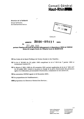 portant fixation des prix de journée hébergement et dépendance 2006 de l'EHPAD soins de longue durée de l'hôpital local de MASEVAUX. Resumé Pièces jointes ARRETE Assemblée : Non défini Date : 20/01/2006 Rapporteur : Non défini Collectivité : Conseil départemental du Haut-Rhin Direction : Non défini Service : Service de la Tarification des Etablissements Domaine : Prix de Journée Commission :