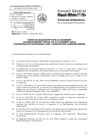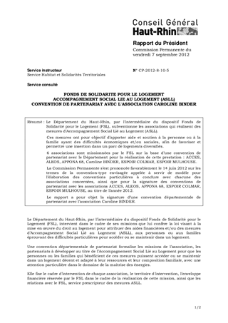 Le Département du Haut-Rhin, par l’intermédiaire du dispositif Fonds de Solidarité pour le Logement (FSL), subventionne les associations qui réalisent des mesures d’Accompagnement Social Lié au Logement (ASLL). Ces mesures ont pour objectif d’apporter aide et soutien à la personne ou à la famille ayant des difficultés économiques et/ou sociales, afin de favoriser et permettre une insertion dans un parc de logements diversifiés. 6 associations sont missionnées par le FSL sur la base d’une convention de partenariat avec le Département pour la réalisation de cette prestation : ACCES, ALEOS, APPONA 68, Caroline BINDER, ESPOIR COLMAR, ESPOIR MULHOUSE. La Commission Permanente s’est prononcée favorablement le 14 juin 2012 sur les termes de la convention-type envisagée appelée à servir de modèle pour l’élaboration des conventions particulières à conclure avec chacune des associations concernées, ainsi que pour la signature des conventions de partenariat avec les associations ACCES, ALEOS, APPONA 68, ESPOIR COLMAR, ESPOIR MULHOUSE, au titre de l’année 2012. Le rapport a pour objet la signature d’une convention départementale de partenariat avec l’association Caroline BINDER.
