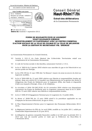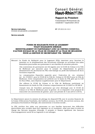 FONDS DE SOLIDARITE POUR LE LOGEMENT VOLET SOLIDARITE ENERGIE RENOUVELLEMENT DU PARTENARIAT AVEC LE CENTRE COMMUNAL D'ACTION SOCIALE DE LA VILLE DE COLMAR ET LA VILLE DE MULHOUSE POUR LA GESTION DU SECRETARIAT FSL "ENERGIE"