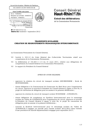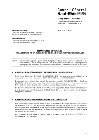 Le présent rapport a pour objet d'approuver deux conventions de délégation de compétences pour l'organisation de transports scolaires de regroupements pédagogiques, avec une participation financière du Conseil Général du Haut-Rhin.