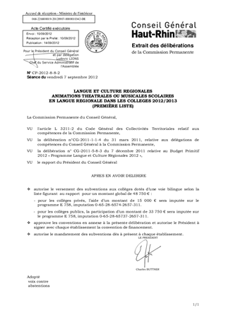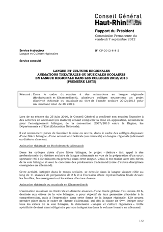 Dans le cadre du soutien à des animations en langue régionale (Hochdeutsch et Elsasserditsch), plusieurs collèges soumettent un projet d’activité théâtrale ou musicale au titre de l'année scolaire 2012/2013 pour un montant total de 48 750 €.