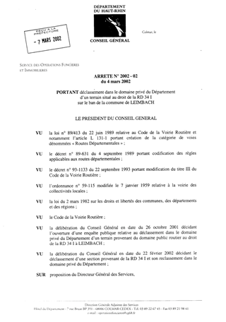 Portant déclassement dans le domaine privé du Département d'un terrain situé au droit de la RD 34 I sur le ban de la commune de LEIMBACH Resumé Pièces jointes ARRETE Assemblée : Non défini Date : 07/03/2002 Rapporteur : Non défini Collectivité : Conseil départemental du Haut-Rhin Direction : Non défini Service : Service du Patrimoine et du droit des Sols Domaine : Déclassement de voirie Commission :
