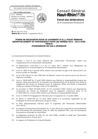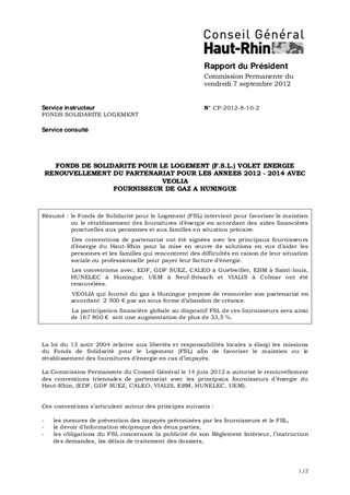 FONDS DE SOLIDARITE POUR LE LOGEMENT (F.S.L.) VOLET ENERGIE RENOUVELLEMENT DU PARTENARIAT POUR LES ANNEES 2012 - 2014 AVEC VEOLIA FOURNISSEUR DE GAZ A HUNINGUE