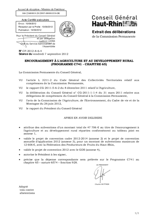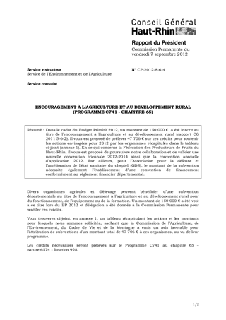 Dans le cadre du Budget Primitif 2012, un montant de 150 000 € a été inscrit au titre de l’encouragement à l’agriculture et au développement rural (rapport CG 2011 5-6-2). Il vous est proposé de prélever 47 706 € sur ces crédits pour soutenir les actions envisagées pour 2012 par les organismes récapitulés dans le tableau ci-joint (annexe 1). En ce qui concerne la Fédération des Producteurs de Fruits du Haut-Rhin, il vous est proposé de poursuivre notre collaboration et de valider une nouvelle convention triennale 2012-2014 ainsi que la convention annuelle d’application 2012. Par ailleurs, pour l’Association pour la défense et l’amélioration de l’état sanitaire du cheptel (GDS), le montant de la subvention nécessite également l’établissement d’une convention de financement conformément au règlement financier départemental.