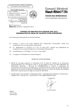Dans le cadre du présent rapport, il vous est proposé, compte tenu des circonstances exceptionnelles évoquées, de proroger jusqu’au 31 décembre 2014 le délai de validité de la subvention d’investissement de 4 133 000 € accordée en 2009 à l’Etat pour l’opération de construction d’un institut de recherche et extension restructuration de l’Ecole Nationale Supérieure de Chimie de Mulhouse (ENSCMu) afin de permettre de régler le solde.