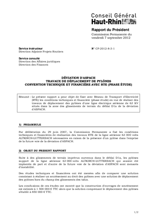 Le présent rapport a pour objet de fixer avec Réseau de Transport d'Electricité (RTE) les conditions techniques et financière (phase étude) en vue de réaliser des travaux de déplacement des pylônes d'une ligne électrique aérienne de 63 KV situés dans la zone des glissements de terrain du déblai D1a de la déviation d'ASPACH.