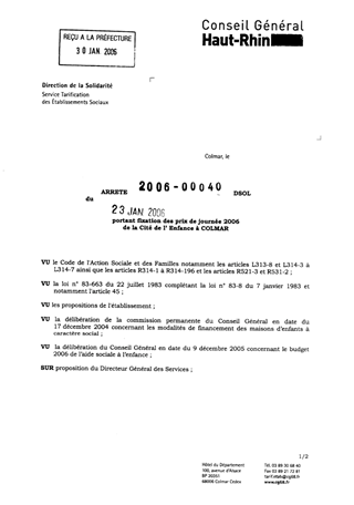 portant fixation des prix de journée 2006 de la Cité de l'Enfance à COLMAR. Resumé Pièces jointes ARRETE Assemblée : Non défini Date : 23/01/2006 Rapporteur : Non défini Collectivité : Conseil départemental du Haut-Rhin Direction : Non défini Service : Service de la Tarification des Etablissements Domaine : Prix de Journée Commission :