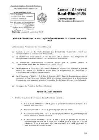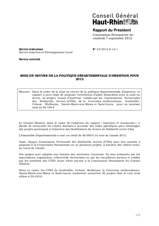 MISE EN OEUVRE DE LA POLITIQUE DÉPARTEMENTALE D'INSERTION POUR 2012