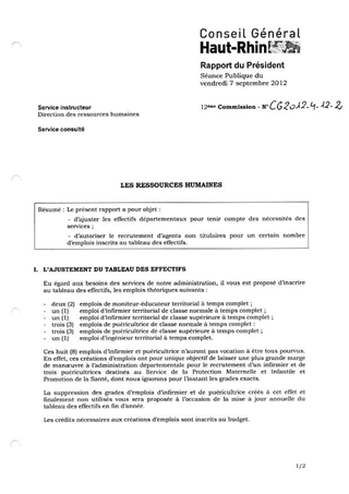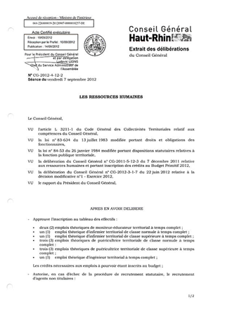 LES RESSOURCES HUMAINES Resumé Pièces jointes DELIBERATION RAPPORT Assemblée : Conseil General Date : 07/09/2012 Rapporteur : Non défini Collectivité : Conseil départemental du Haut-Rhin Direction : Non défini Service : Direction des Ressources Humaines et Dialogue Social Domaine : Administration Commission : Assemblée Départementale