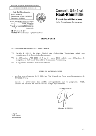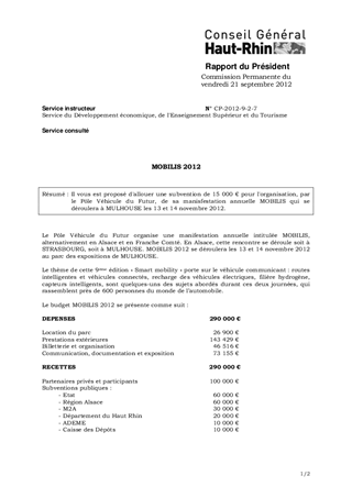 Il vous est proposé d'allouer une subvention de 15 000 € pour l'organisation, par le Pôle Véhicule du Futur, de sa manisfestation annuelle MOBILIS qui se déroulera à MULHOUSE les 13 et 14 novembre 2012.