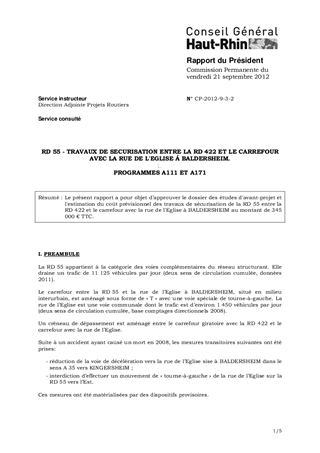 Le présent rapport a pour objet d’approuver le dossier des études d'avant-projet et l'estimation du coût prévisionnel des travaux de sécurisation de la RD 55 entre la RD 422 et le carrefour avec la rue de l'Eglise à BALDERSHEIM au montant de 345 000 € TTC.