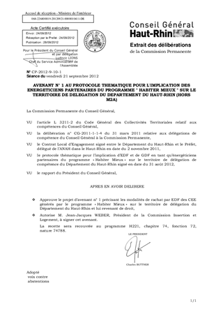 AVENANT N° 1 AU PROTOCOLE THEMATIQUE POUR L'IMPLICATION DES ENERGETICIENS PARTENAIRES DU PROGRAMME " HABITER MIEUX " SUR LE TERRITOIRE DE DELEGATION DU DEPARTEMENT DU HAUT-RHIN (HORS M2A)