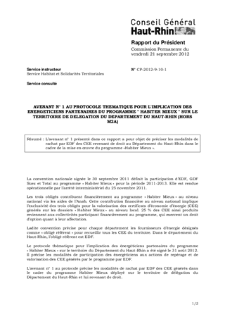 L’avenant n° 1 présenté dans ce rapport a pour objet de préciser les modalités de rachat par EDF des CEE revenant de droit au Département du Haut-Rhin dans le cadre de la mise en œuvre du programme «Habiter Mieux ».