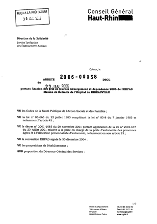 portant fixation des prix de journée hébergement et dépendance 2006 de l'EHPAD maison de retraite de l'hôpital de RIBEAUVILLE. Resumé Pièces jointes ARRETE Assemblée : Non défini Date : 23/01/2006 Rapporteur : Non défini Collectivité : Conseil départemental du Haut-Rhin Direction : Non défini Service : Service de la Tarification des Etablissements Domaine : Prix de Journée Commission :