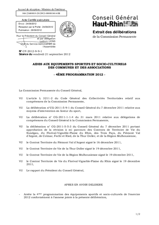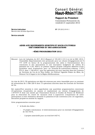 Lors de l'adoption du B.P. 2012 (Rapport n° CG-2011-5-9-1) et de la DM1 2012, l'Assemblée départementale s'est prononcée pour un volume d'engagements de 8 774 227€ en faveur de la programmation des aides à l’investissement des communes et des associations et une inscription budgétaire de crédits de paiement de 4 251 836 €. Le présent rapport propose l'adoption définitive d'une quatrième série d'opérations pour un montant de subventions s'élevant 1 879 974 €, dont 1 709 643 € pour les opérations qui sont inscrites dans les Contrats de Territoire de Vie de la Thur Doller, du Florival Vignoble Plaine du Rhin, du Piémont Val d'Argent et de la Région Mulhousienne.