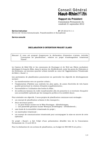 Il vous est proposé d'approuver la déclaration d'intention ci-jointe, intitulée "Convention de planification", relative au projet d'aménagement trinational "3Land".
