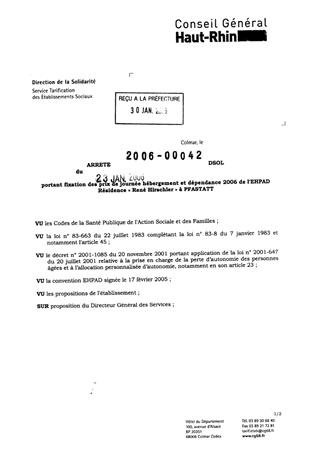 portant fixation des prix de journée hébergement et dépendance 2006 de l'EHPAD résidence "René Hirschler" à PFASTATT. Resumé Pièces jointes ARRETE Assemblée : Non défini Date : 23/01/2006 Rapporteur : Non défini Collectivité : Conseil départemental du Haut-Rhin Direction : Non défini Service : Service de la Tarification des Etablissements Domaine : Prix de Journée Commission :