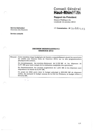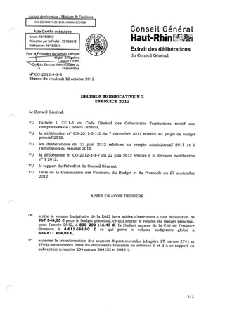 DECISION MODIFICATIVE N° 2 DE l'EXERCICE 2012 Resumé Pièces jointes DELIBERATION RAPPORT Assemblée : Conseil General Date : 12/10/2012 Rapporteur : Non défini Collectivité : Conseil départemental du Haut-Rhin Direction : Non défini Service : Direction des Finances Domaine : Administration Commission : Assemblée Départementale