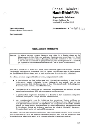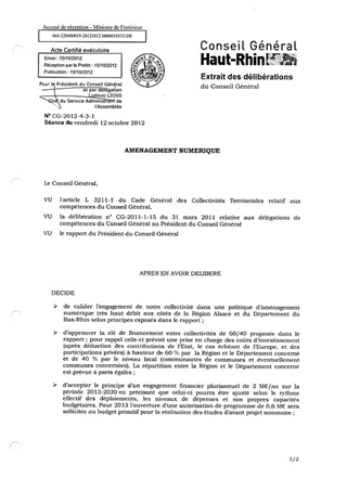 AMENAGEMENT NUMERIQUE Resumé Pièces jointes DELIBERATION RAPPORT Assemblée : Conseil General Date : 12/10/2012 Rapporteur : Non défini Collectivité : Conseil départemental du Haut-Rhin Direction : Non défini Service : Mission des Grands Equipements Domaine : Communication Commission : Assemblée Départementale