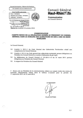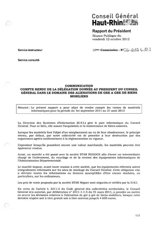 COMMUNICATION - COMPTE RENDU DE LA DELEGATION DONNEE AU PRESIDENT DU CONSEIL GENERAL DANS LE DOMAINE DES ALIENATIONS DE GRE A GRE DE BIENS IMMOBILIERS. Resumé Pièces jointes DELIBERATION RAPPORT Assemblée : Conseil General Date : 12/10/2012 Rapporteur : Non défini Collectivité : Conseil départemental du Haut-Rhin Direction : Non défini Service : Direction des Systèmes d'Information Domaine : Administration Commission : Assemblée Départementale