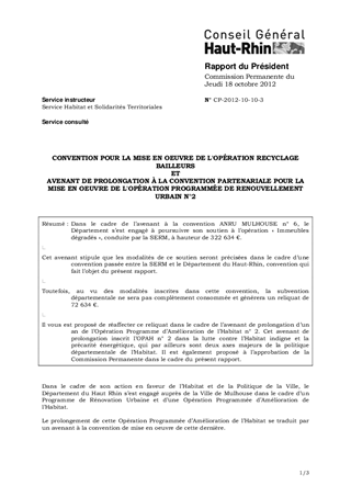 CONVENTION POUR LA MISE EN OEUVRE DE L'OPÉRATION "RECYCLAGE BAILLEURS " ET AVENANT DE PROLONGATION À LA CONVENTION PARTENARIALE POUR LA MISE EN OEUVRE DE L'OPÉRATION PROGRAMMÉE DE RENOUVELLEMENT URBAIN N°2