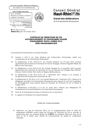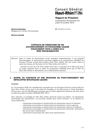 Dans le cadre du financement d'une première programmation, il est proposé d'accompagner le financement d'actions éligibles aux programmes LEADER du Groupe d'Action Locale haut-rhinois (GAL Thur Doller) tels que prévu dans le cadre du Contrat de Territoire de Vie Thur Doller 2010-2013 : - Soutien au titre du CTV Thur Doller 2010-2013, à hauteur de 4 000 euros pour un projet présenté dans le cadre du programme LEADER porté par le GAL du Pays Thur Doller et nécessitant un co-financement national.